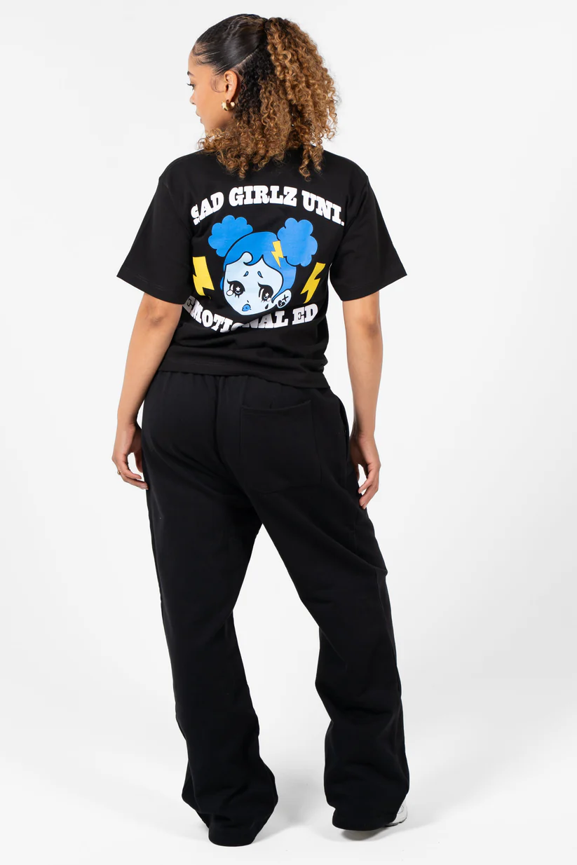 The Sad-Boyz UC Sad Tee reimagines a classic streetwear essential through emotional symbolism and refined detailing. The black base represents depth, introspection, and calm strength, while the rhinestone detailing adds contrast—symbolizing clarity and individuality within darkness. This tee is designed to stand out quietly, combining emotional weight with visual impact.